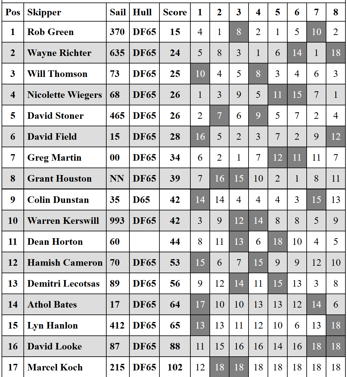 Despite the light rain, the southeast breeze kept the DF65 fleet moving. Rob Green’s ability to recover from his discard (a 10th in Race 7) and maintain low scores throughout the rest of the day earned him the title. Congratulations to all skippers who braved the elements for a fantastic day of racing!